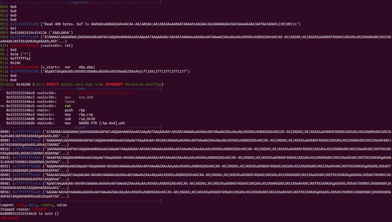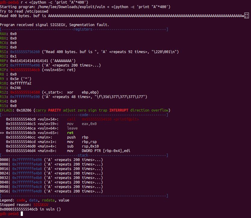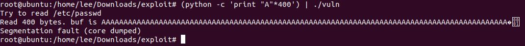 #> (python -c 'print "A"*400') | ./vuln