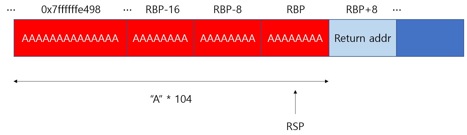 즉 Return addr 까지 접근할때 A는 104개 이다. 이를 통해 페이로드를 만들 때 104개를 기준으로 생각할수 있다.